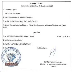 Apostille Cyprus criminal record certificates (Previous Convictions Registry). Certificates can be obtained from the Cyprus Police or we can obtain certificates in Cyprus on behalf of clients requiring their authentication. Please Contact us for assistance.Cypriot Education Certificates