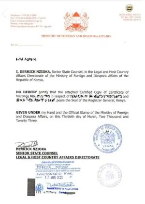 Kenyan birth death and marriage certificates can be legalized at the Ministry of Foreign & Diaspora Affairs and at the embassy of the recipient country in Nairobi. Certificates must be issued by the Registrar of Births/Deaths or Marriages. Islamic Marriage Certificates must be certified and stamped by the Chief Kadhi’s Chambers in Mombasa or Deputy Chief Kadhi in Nairobi.